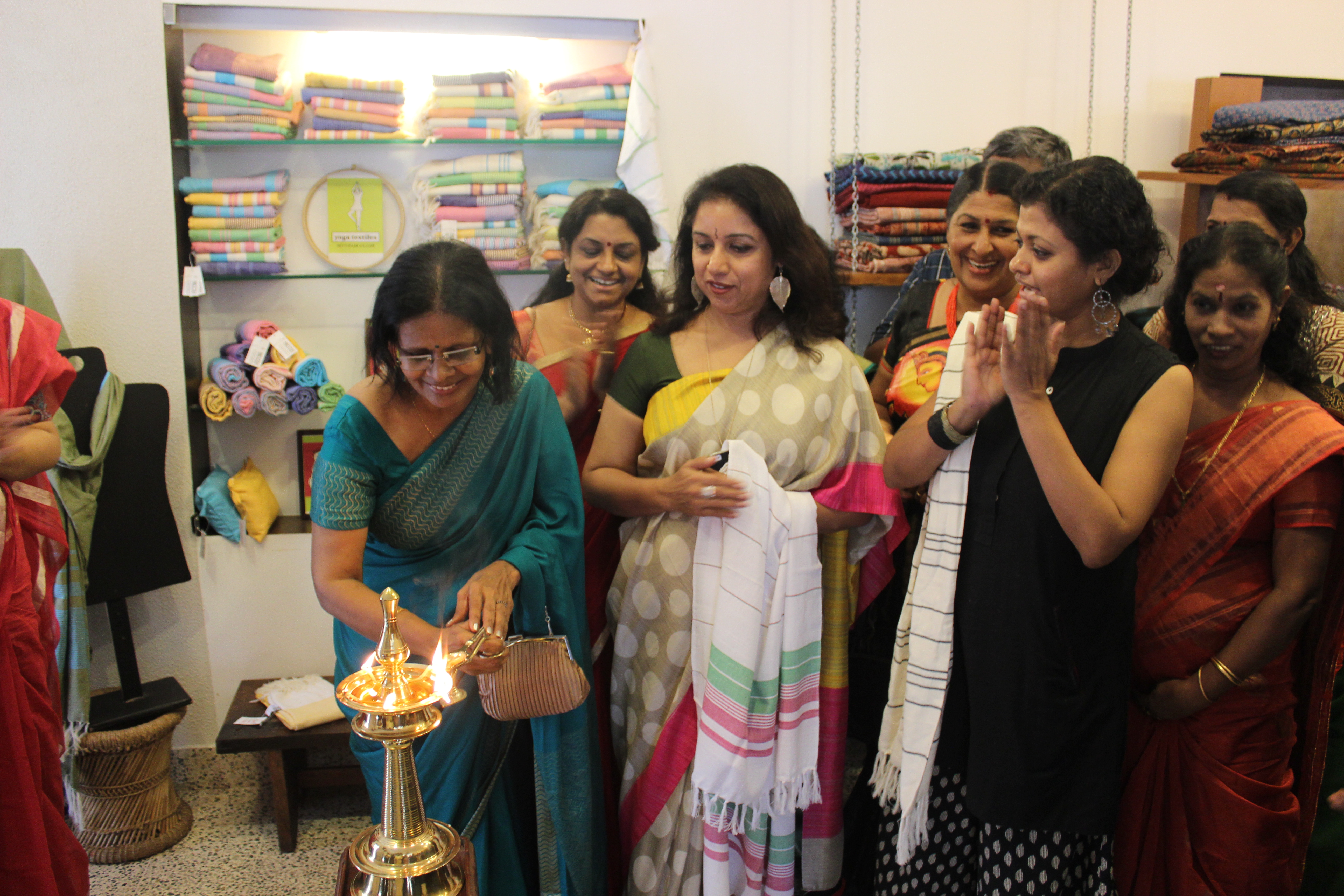 Indu menon, brain behind kara ventures and neyth fabrics lighting the lamp with partner and cofounder Revathy,film personality, Lakshmi, goodkarma lady, Suma, Komala, Usha, cousins looking on and making it an all ladies affair