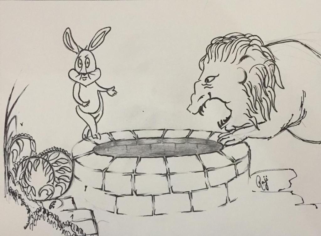 Rabbit ran back and told the animals, lion is in the well. He will not eat us. They were all happy.