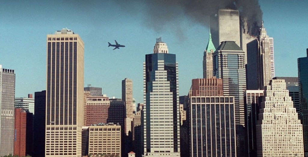 He sees a picture of 911 at a military exhibition, tower on fire, he comments, there is a building on fire and a plane is coming to rescue.